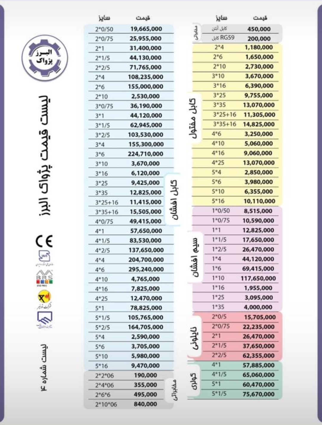 سیم و کابل پژواک البرز با داشتن استاندارد ملی ایران و تولید مطابق با استانداردهای بینالمللی، یکی از برندهای معتبر و اقتصادی بازار به شمار میرود. این برند انواع سیمهای افشان، سیمهای مفتولی، کابلهای قدرت، کابلهای کنترل و کابلهای مخابراتی را با کیفیت بالا و قیمت مناسب عرضه میکند.