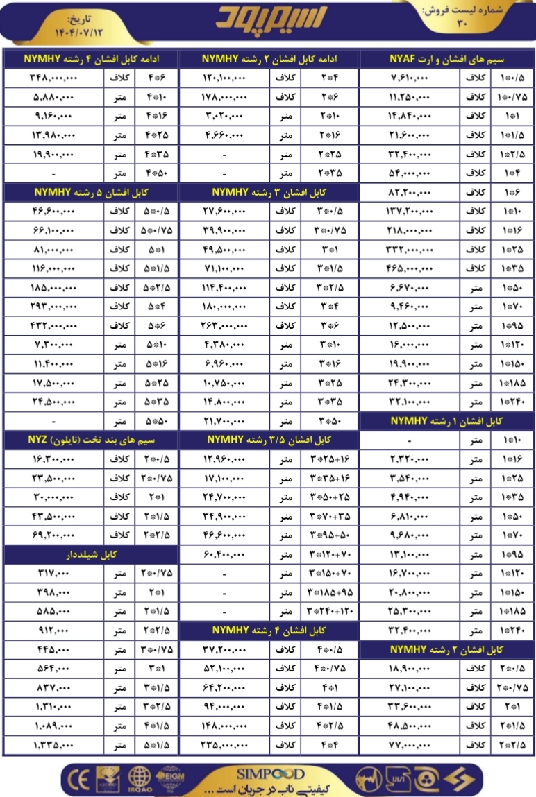 برند سیم و کابل سیمپود یکی از تولیدکنندگان معتبر و شناختهشده در صنعت برق ایران است که با بهرهگیری از فناوری روز و مواد اولیه باکیفیت، انواع سیم افشان و کابلهای استاندارد را مطابق با نیاز پروژههای ساختمانی، صنعتی و تاسیساتی عرضه میکند. محصولات این برند با استفاده از هادی مسی خالص، عایق PVC مقاوم و تاییدیه توانیر تهران تولید میشوند و به دلیل کیفیت بالا، دوام طولانی و قیمت رقابتی، انتخابی مطمئن برای پیمانکاران، مهندسان و مصرفکنندگان خانگی به شمار میروند.